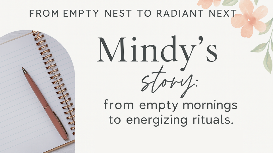 Mindy's only child just left for college...8 hours away. The silence at home felt deafening. She wanders through the day unsure of what to do with herself, staring at the clock and wondering how to fill the hours that used to be overflowing with responsibility. What if your days felt purposeful again—not just busy, but joyful? What if mornings started with coffee and a soul-clearing walk, afternoons held space for creativity, and evenings ended with rituals that actually nourished you? What if you woke up excited—not for anyone else’s agenda—but for YOUR life again?
